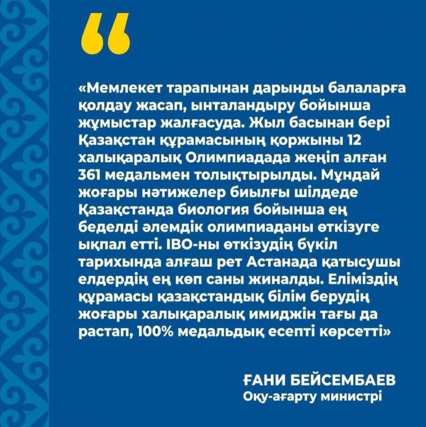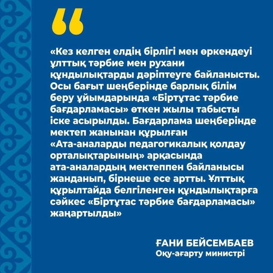16 август 2024 0 1 2 3 4 5 Оқу-ағарту министрі Ғани Бейсембаевтың Астана қаласы педагогтерінің қалалық тамыз форумында сөйлеген сөзінен.