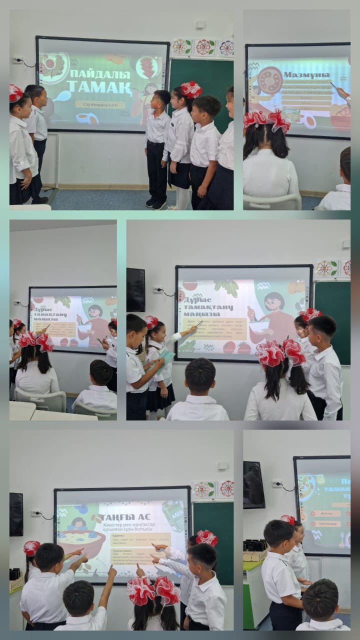 Сабақта оқушылардың бір-бірлеріне жақсы тілектерін айтумен басталды. Сабақты “Ой қозғау” әдісі арқылы топ болып сурет бойынша сұраққа жауап берді. “Дұрыс тамақтана біл” тақырыбына байланысты “Анықта” әдісін қолдана отырып, жеке жұмыс орындады. Сергіту сәтінде “Оң,сол” ойыны ойнатылды. Сабақты бекіту мақсатында “wordwall” платформасында оқушылар тапсырма орындады. Стикерлермен кері байланыс алынды.