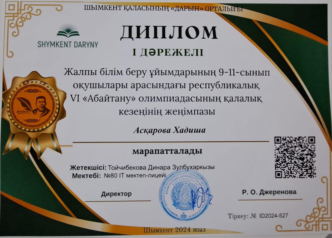 Жалпы білім беру ұйымдарының 9-11 сынып оқушылары  арасындағы республикалық ҮІ "Абайтану" олимпиадасының қалалық кезеңінде №80 ІТ мектеп-лицейінің 11-сынып оқушысы Асхарова Хадиша жүлделі 🥇І орын иеленді.