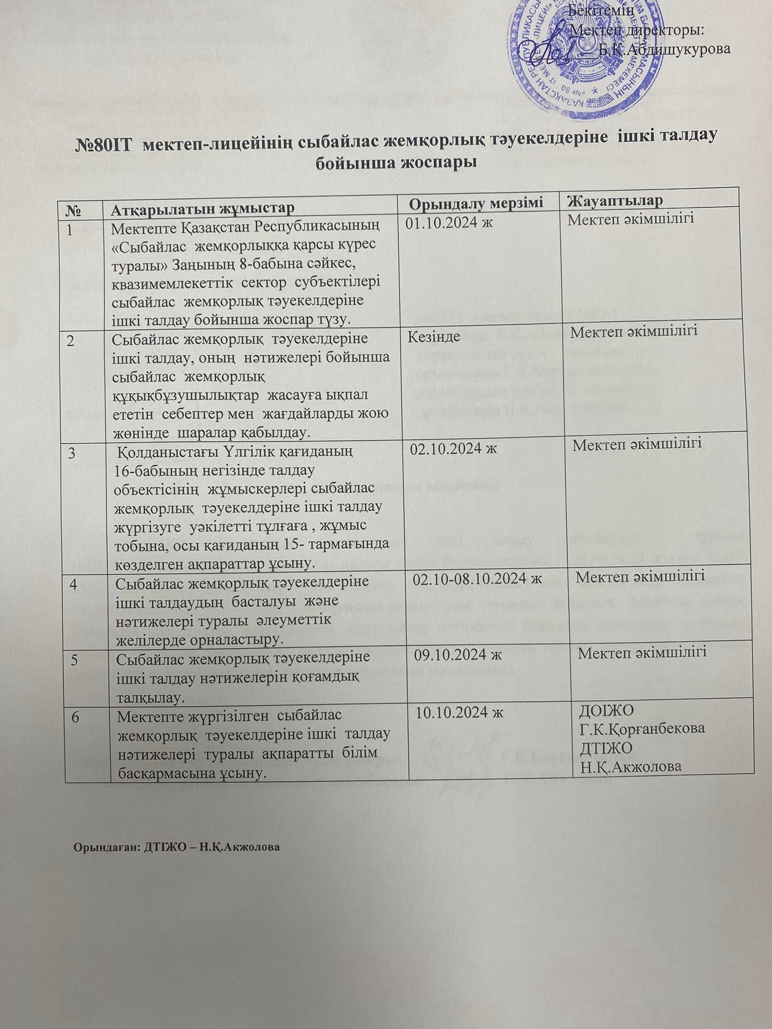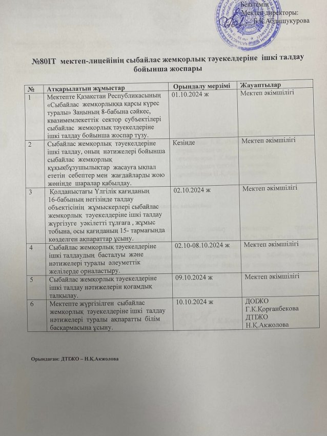 10 октябрь 2024 0 1 2 3 4 5 «Сыбайлас жемқорлық тәуекелдеріне» ішкі талдау Шымкент қаласы білім басқармасына қарасты IT Школа-лицей №80нің «Сыбайлас жемқорлық тәуекелдеріне» ішкі талдау нәтижелерін қоғамдық талқылаудың жүргізіліп, аналитикалық есебі жасалынғандығы туралы хабарлайды.